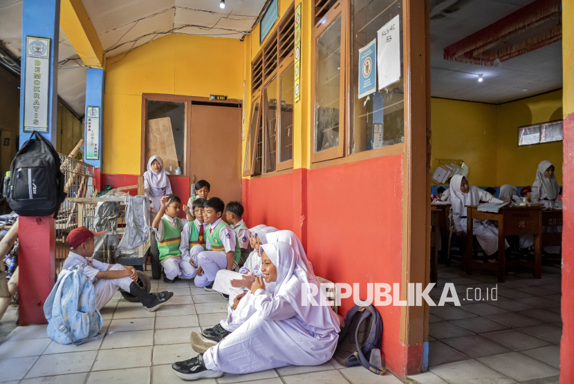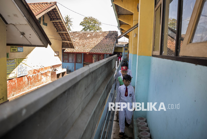 Sejumlah murid menunggu giliran untuk memasuki ruang kelas di SDN Bunisari, Ngamprah, Kabupaten Bandung Barat, Jawa Barat, Senin (13/4/2026). Penutupan akses pada bangunan belakang sekolah oleh pihak ahli waris lahan tersebut menyebabkan delapan ruang kelas, satu ruang guru, dan satu perpustakaan tidak dapat digunakan untuk kegiatan belajar mengajar (KBM) serta menimbulkan keresahan di lingkungan sekolah sehingga pihak sekolah menerapkan sistem kelas bergantian bagi seluruh murid guna proses pembelajaran tetap berjalan. (FOTO : ANTARA FOTO/Abdan Syakura)