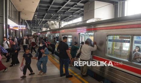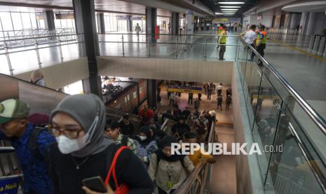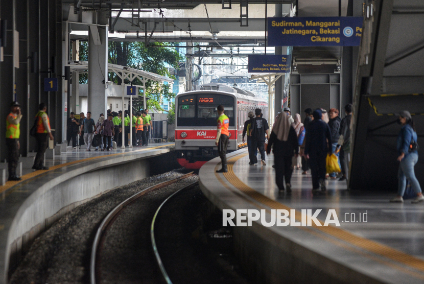 Penumpang berjalan turun dari KRL di Stasiun Tanah Abang Baru, Jakarta, Jumat (17/10/2025). Stasiun Tanah Abang kini telah bertransformasi dan beroperasi dengan wajah barunya. Salah satu stasiun kereta terpadat tersebut kini mampu melayani hingga 300.000 penumpang per hari. Pengoperasian Stasiun Tanah Abang Baru ini menandai babak baru integrasi transportasi modern di jantung Jakarta yang lebih efisien, aman, dan nyaman bagi penumpang. (FOTO : Republika/Prayogi)
