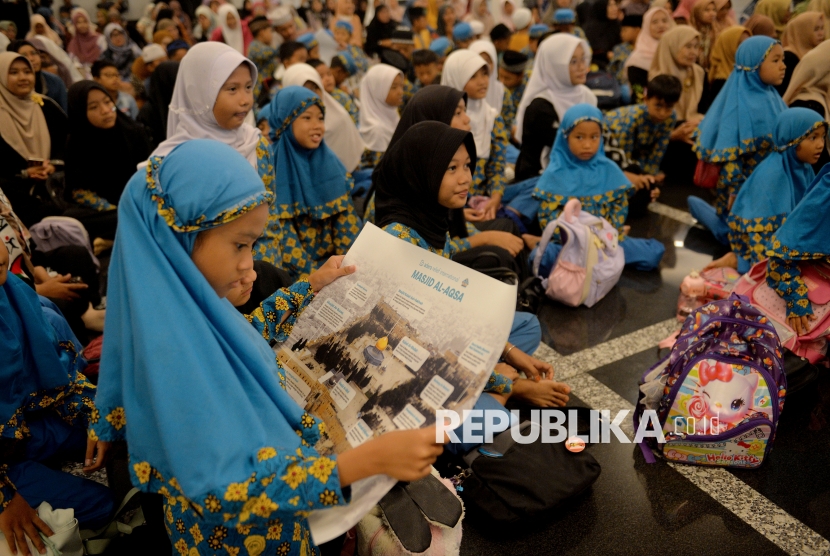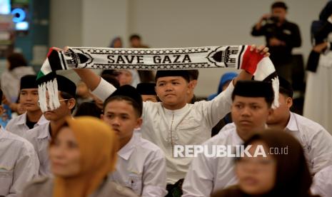 Seorang anak mengikuti sesi mendongeng Kak Inar dan Boneka Mentari dalam Kisah Palestina saat acara Dzikir Nasional Republika di Masjid At-Thohir, Rabu (31/12/2025). (FOTO : Edwin Putranto/Republika)