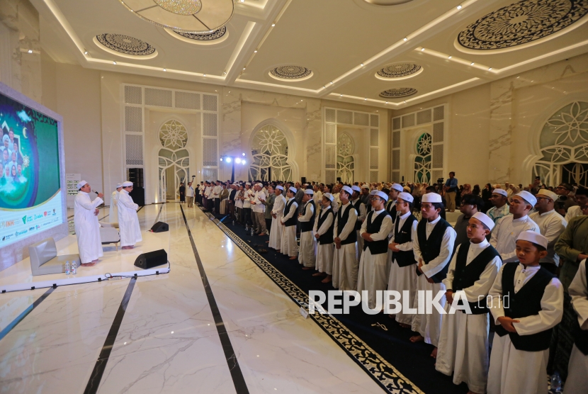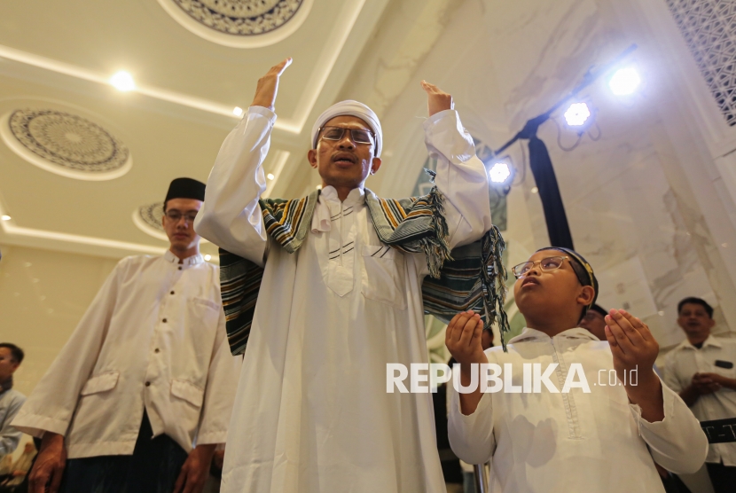 Ketua Umum JATMAN DKI KH Muhammad Danial Nafis memimpin dzikir saat momen pergantian tahun dalam acara Dzikir Nasional Republika di Masjid At-Thohir, Cimanggis, Depok, Jawa Barat, Rabu (1/1/2026). Dzikir yang dipimpin Ketua Umum JATMAN DKI KH Muhammad Danial Nafis tersebut diikuti oleh ratusan jamaah yg digelar dalam rangka menyambut tahun baru dengan mendekatkan diri pada Allah SWT. (FOTO : Republika/Thoudy Badai)