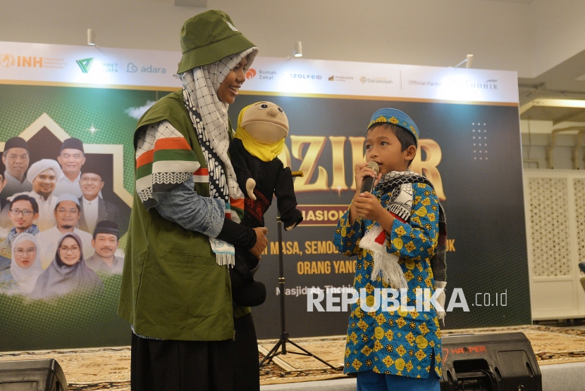Kak Inar dan Boneka Mentari tampil mendongeng dalam Kisah Palestina saat acara Dzikir Nasional Republika di Masjid At-Thohir, Rabu (31/12/2025). (FOTO : Edwin Putranto/Republika)