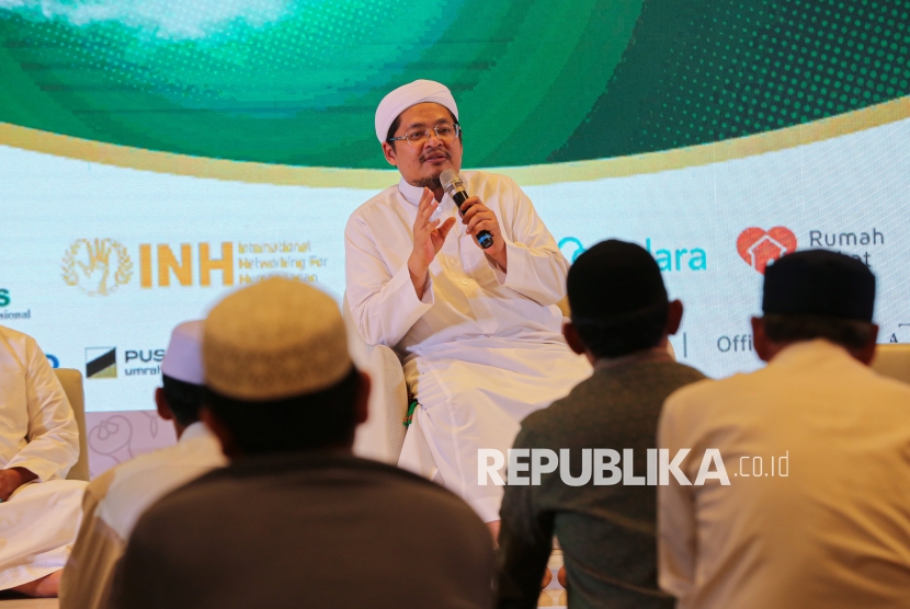 Ketua Yayasan Al Fachriyah, Habib Jindan menyampaikan tausiyah dalam acara Dzikir Nasional Republika di Masjid At-Thohir di Cimanggis, Depok, Kamis (31/12/2025). (FOTO : Republika/Thoudy Badai)