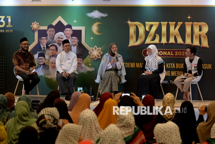 Ketua Yayasan Dompet Dhuafa Ahmad Juwaini, Aktivis Sosial Chiki Fawzi, Aktivis Adara dan Aktivis International Networking Humanitarian menjadi pembicara saat acara bincang Palestina dalam rangkaian acara Dzikir Nasional Republika di Masjid At-Thohir, Rabu (31/12/2025). (FOTO : Edwin Putranto/Republika)