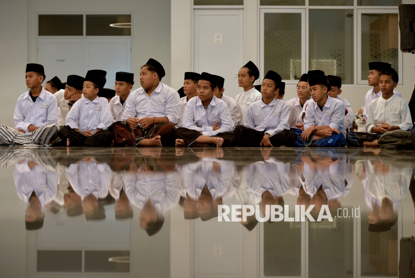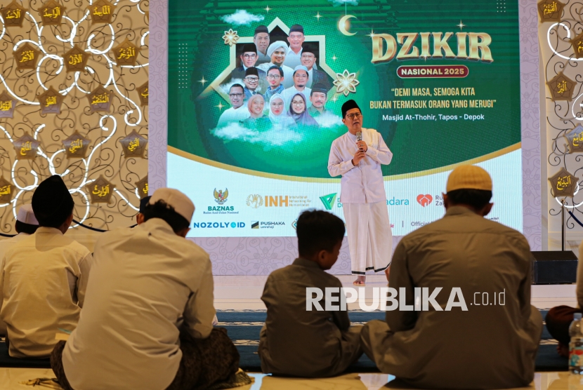 Pimpinan Baznas RI Bidang Koordinasi Nasional, Achmad Sudrajat menyampaikan tausiyah dalam acara Dzikir Nasional Republika di Masjid At-Thohir di Cimanggis, Depok, Kamis (31/12/2025). Kegiatan Dzikir Nasional Republika kali ini mengangkat tema Demi Masa, Semoga Kita Bukan Termasuk Orang yang Merugi. (FOTO : Republika/Thoudy Badai)