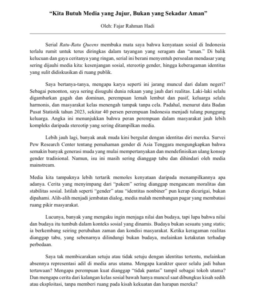 Sebagai mahasiswa dari rumpun studi sosial humaniora dan lahir sebagai generasi muda, saya melihat ini sebagai pengingat pentingnya keberanian bersuara, meski tekanan sosial dan moral semakin ketat. Kita membutuhkan lebih banyak media yang berani, tidak hanya bermain amandan memenuhi standar lama, tapi benar-benar mencerminkan wajah masyarakat Indonesia yang beragam, penuh warna, dan tidak selalu rapi supaya lebih terdukasi dan terbuka.