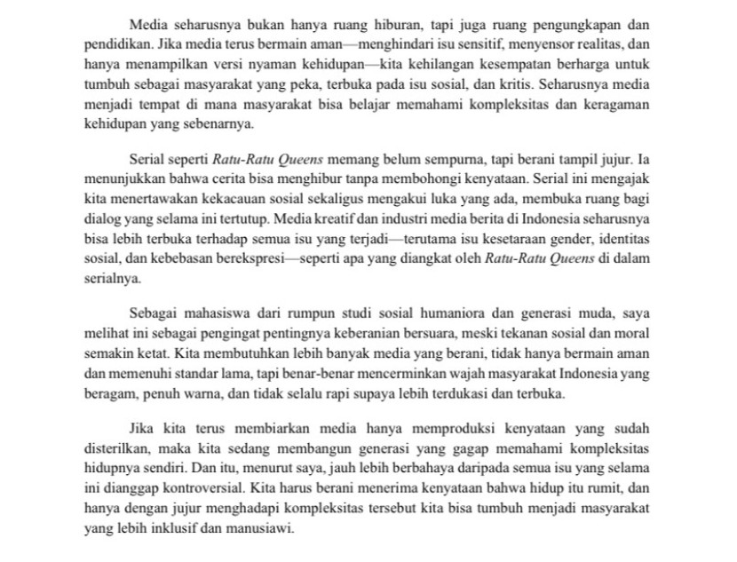 Serial seperti Ratu-Ratu Queens memang belum sempurna, tapi berani tampil jujur. Ia menunjukkan bahwa cerita bisa menghibur tanpa membohongi kenyataan. Serial ini mengajak kita menertawakan kekacauan sosial sekaligus mengakui luka yang ada, membuka ruang bagi dialog yang selama ini tertutup. Media kreatif dan industri media berita di Indonesia seharusnya bisa lebih terbuka terhadap semua isu yang terjadi—terutama isu kesetaraan gender, identitas sosial, dan kebebasan berekspresi—seperti apa yang diangkat oleh Ratu-Ratu Queens di dalam serialnya.