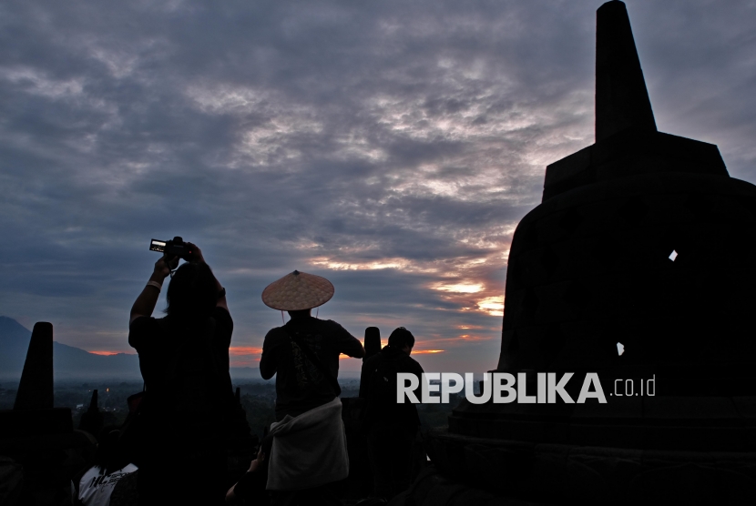 REPUBLIKA.CO.ID, MAGELANG -- Wisatawan menyaksikan matahari terbit saat wisata Sunrise Borobudur di Taman Wisata Borobudur, Magelang, Jawa Tengah, Kamis (1/1/2026).