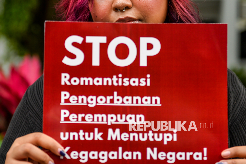 REPUBLIKA.CO.ID, BANDUNG -- Massa yang tergabung dalam Aliansi Simpul Puan menunjukan poster saat melakukan unjuk rasa dalam rangka Hari Perempuan Internasional di Jalan Asia Afrika, Bandung, Jawa Barat, Ahad (8/3/2026).