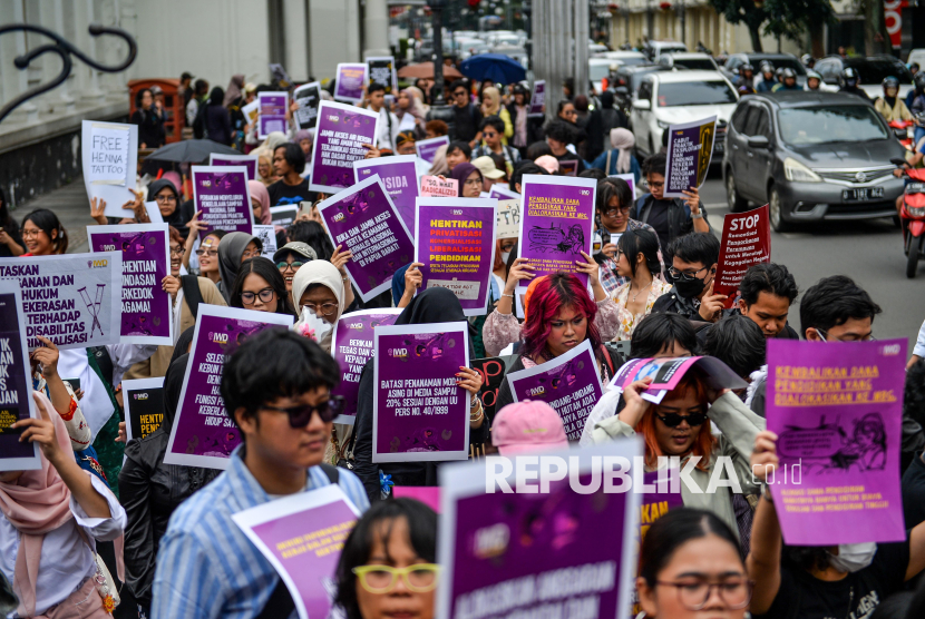 Massa yang tergabung dalam Aliansi Simpul Puan berjalan kaki saat melakukan unjuk rasa dalam rangka Hari Perempuan Internasional di Jalan Asia Afrika, Bandung, Jawa Barat, Ahad (8/3/2026). Dalam aksinya mereka menuntut pemerintah agar hentikan militerisasi di ranah publik dan campur tangan militer dalam kebijakan sipil, termasuk program pangan dan sosial serta cabut kebijakan dan praktik kriminalisasi rakyat, aktivis, buruh, perempuan melalui KUHP dan KUHAP. (FOTO : ANTARA FOTO/Raisan Al Farisi)