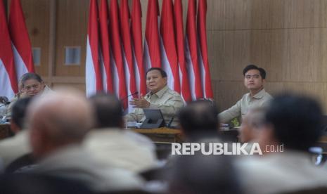 Presiden Prabowo Subianto menyampaikan taklimat awal tahun di Hambalang, Bogor, Jawa Barat, Selasa (6/1/2026). Kegiatan tersebut dihadiri oleh seluruh menteri dan wakil menteri Kabinet Merah Putih, Panglima TNI, Kapolri, para Kepala Staf TNI, serta pimpinan lembaga negara. Kegiatan ini dilaksanakan untuk mengevaluasi kinerja pemerintahan sepanjang tahun 2025. Presiden Prabowo juga memberikan arahan kepada jajarannya dalam merealisasikan program kerja pada tahun 2026. (FOTO : Republika/Prayogi)
