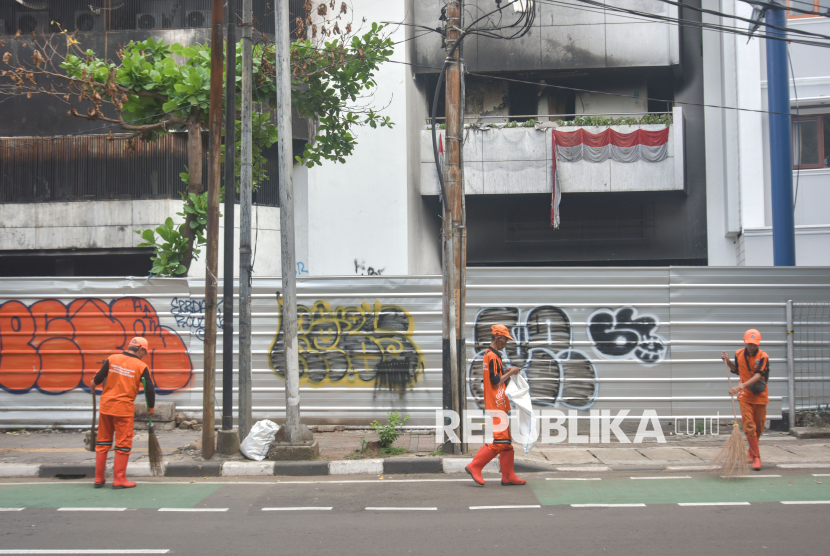 Petugas Penanganan Prasarana dan Sarana Umum (PPSU) menyapu trotoar di depan gedung ACC Kwitang Senen, Jakarta Pusat, Ahad (2/11/2025). Polres Metro Jakarta Pusat menyelidiki penemuan dua kerangka manusia dalam kondisi hangus terbakar dan tidak dapat dikenali di Lantai 2 Gedung ACC usai menerima laporan pada (30/10/2025) dari teknisi gedung yang diduga terbakar pada kerusuhan 29 Agustus 2025 lalu. (FOTO : ANTARA FOTO/Fakhri Hermansyah)