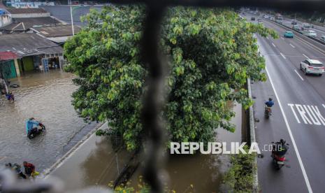 Pengendara sepeda motor melintas di Jalan Tol Lingkar Luar untuk menghindari banjir di Cengkareng, Jakarta. Badan Penanggulangan Bencana Daerah (BPBD) DKI Jakarta mengungkapkan bahwa banjir masih menggenangi 125 Rukun Tetangga (RT) dan 14 ruas jalan pada Jumat pagi. (FOTO : ANTARA FOTO/Naufal Khoirulloh)