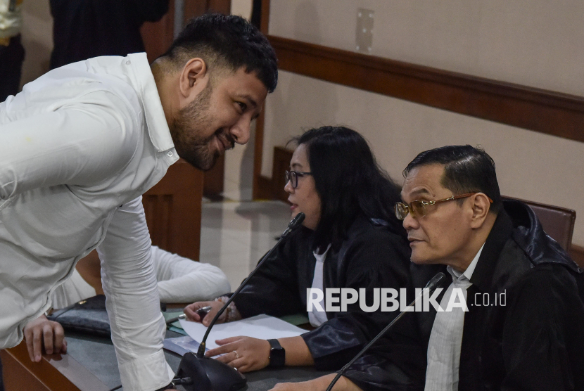 Terdakwa kasus dugaan memperjualbelikan narkotika di dalam Rutan Salemba Muhammad Akbar alias Ammar Zoni (kiri) berbincang dengan kuasa hukumnya usai mengikuti sidang tuntutan di Pengadilan Negeri Jakarta Pusat, Kamis (12/3/2026). Aktor Ammar Zoni dituntut Jaksa Penuntut Umum (JPU) dengan tuntutan sembilan tahun penjara dengan denda Rp500 juta subsider 140 hari penjara. (FOTO : ANTARA FOTO/Fakhri Hermansyah)