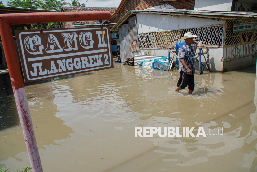 Warga melintasi genangan banjir di Kecamatan Jatiroto, Lumajang, Jawa Timur, Jumat (31/10/2025). Sedikitnya 1.225 rumah warga terdampak banjir setinggi sekitar satu meter akibat luapan Sungai Jatiroto setelah hujan deras mengguyur wilayah tersebut pada Kamis (30/10). (FOTO : ANTARA FOTO/Irfan Sumanjaya)
