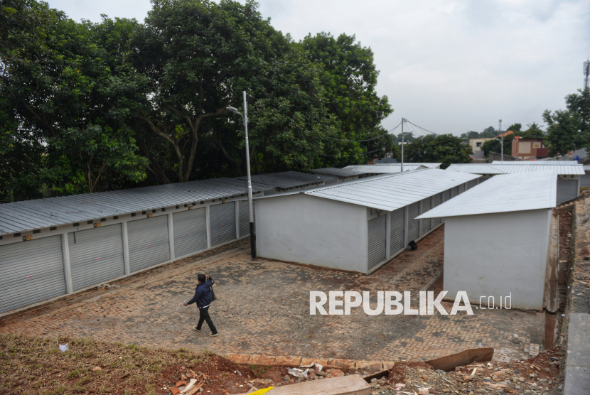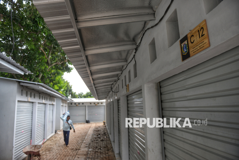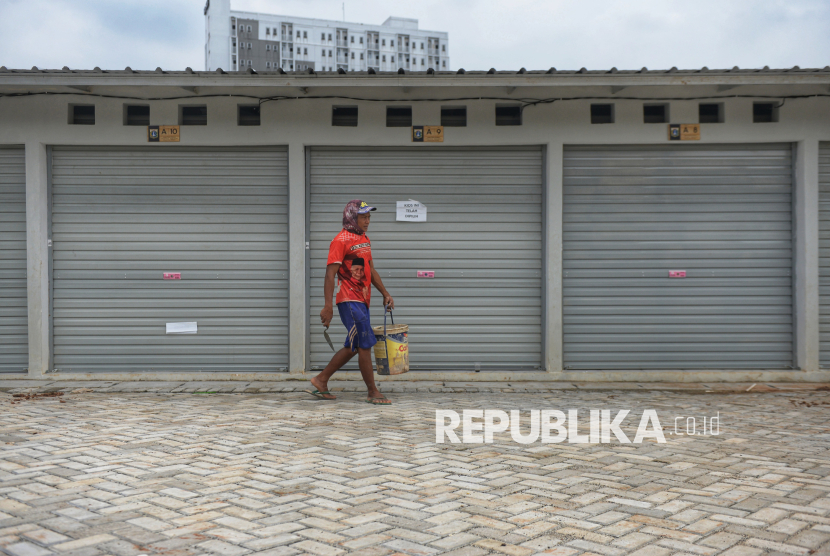 Pekerja beraktivitas di dekat kios di Sentra Fauna dan Kuliner Lenteng Agung, Jakarta, Rabu (29/10/2025). Pasca penggusuran Para pedagang yang pindah ke sentra ini akan mendapat insentif berupa pembebasan biaya sewa kios selama enam bulan. Sentra ini memiliki total 125 kios yang terbagi ke dalam beberapa zona. (FOTO : Republika/Prayogi)