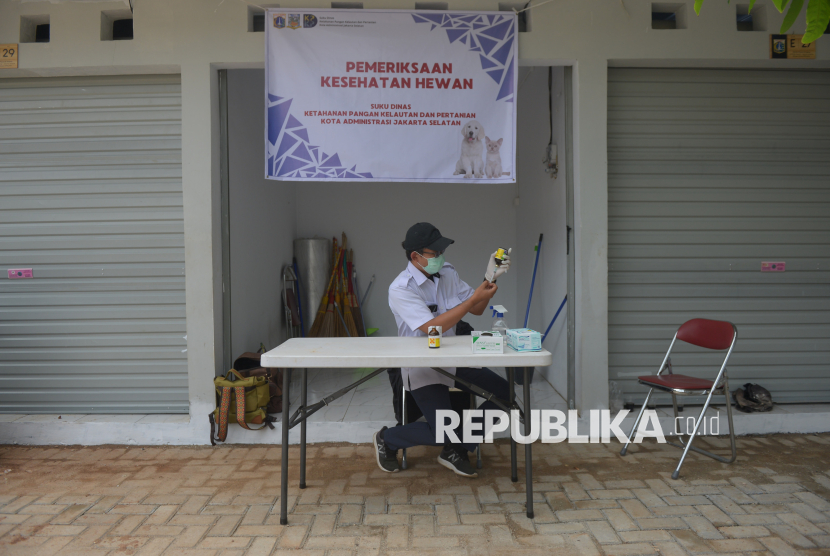 Petugas beraktivitas di posko layanan kesehatan hewan di Sentra Fauna dan Kuliner Lenteng Agung, Jakarta, Rabu (29/10/2025). Sudin KPKP Jakarta Selatan juga telah menyediakan layanan kesehatan hewan gratis di area Sentra Fauna dan Kuliner Lenteng Agung tersebut. (FOTO : Republika/Prayogi)