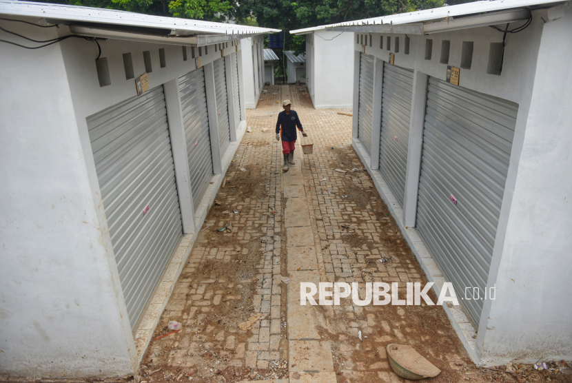 Pekerja beraktivitas di dekat kios di Sentra Fauna dan Kuliner Lenteng Agung, Jakarta, Rabu (29/10/2025). okasi yang diberi nama Sentra Fauna dan Kuliner Lenteng Agung tersebut hampir rampung dan siap ditempati pedagang. (FOTO : Republika/Prayogi)