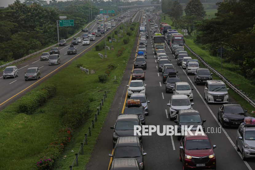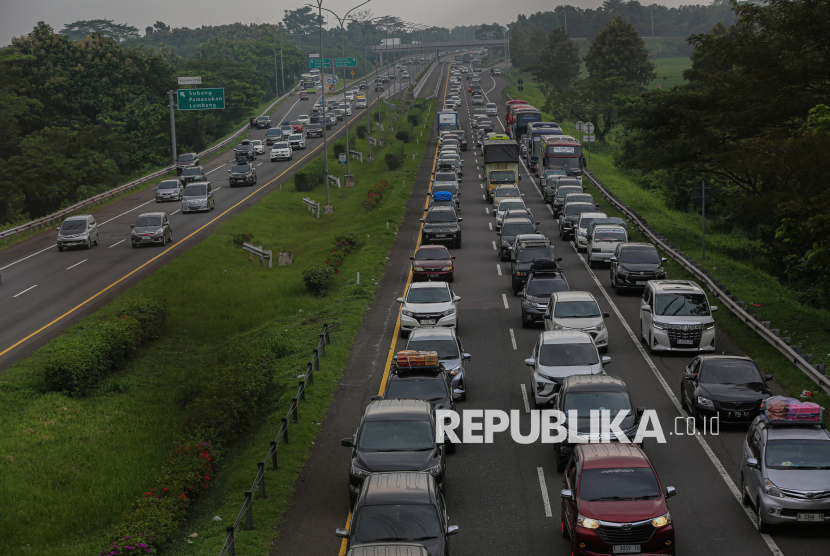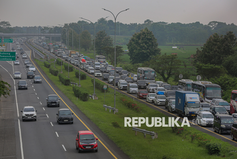 Antrean kendaraan pemudik melintas saat rekayasa lalu lintas satu arah atau one way nasional di Tol Cipali KM 110, Subang, Jawa Barat, Rabu (18/3/2026). Rekayasa lalu lintas satu arah nasional dari KM 70 ruas Tol Jakarta-Cikampek hingga KM 421 ruas Tol Semarang-Solo resmi diterapkan pada pukul 13.30 WIB untuk mengurai kepadatan lalu lintas pada arus mudik Lebaran 2026. (FOTO : Republika/Thoudy Badai)