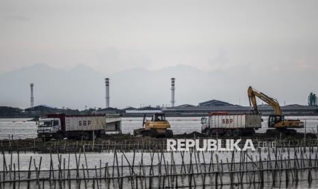 Alat berat mengeruk tanah pada proyek pembangunan Kolam Retensi Terboyo di Semarang, Jawa Tengah, Ahad (2/11/2025). Kementerian PU membangun Kolam Retensi Terboyo sebagai upaya penanganan banjir di wilayah Pantura Semarang–Demak dengan kapasitas volume tampung sebesar 6,7 juta meter kubik dan hingga 25 Oktober 2025 progres pembangunannya telah mencapai 40,86 persen. (FOTO : ANTARA FOTO/Aprillio Akbar)